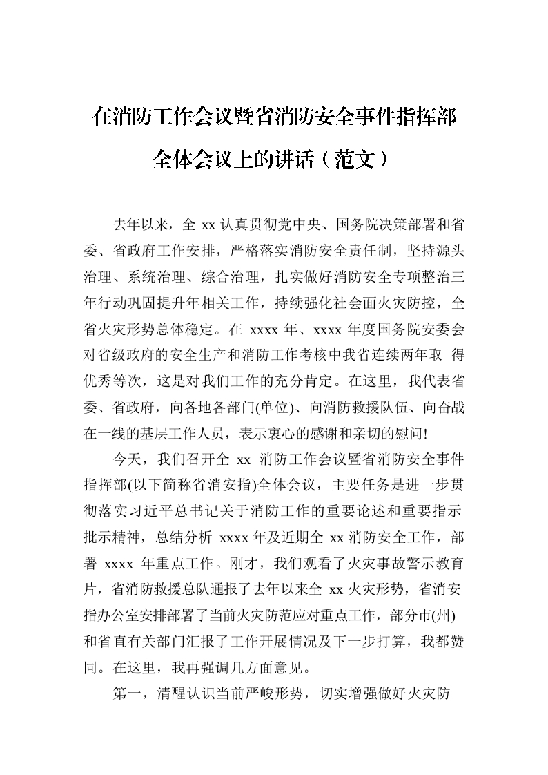 / 在消防工作会议暨省消防安全事件指挥部全体会议上的讲话(范文)