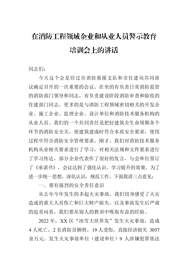 / 在消防工程领域企业和从业人员警示教育培训会上的讲话