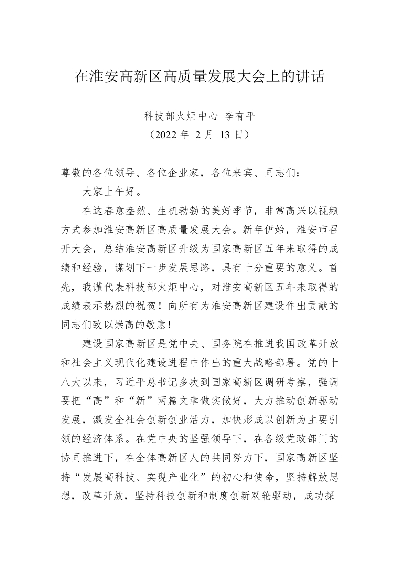 / 在淮安高新区高质量发展大会上的讲话(20220213)
