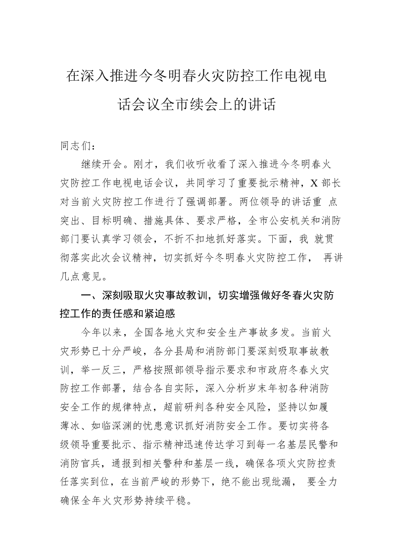 / 在深入推进今冬明春火灾防控工作电视电话会议全市续会上的讲话