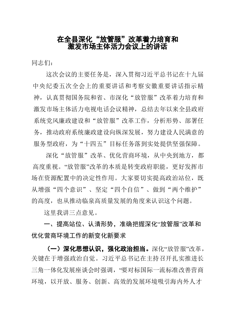 在深化“放管服”改革着力培育和激发市场主体活力的讲话