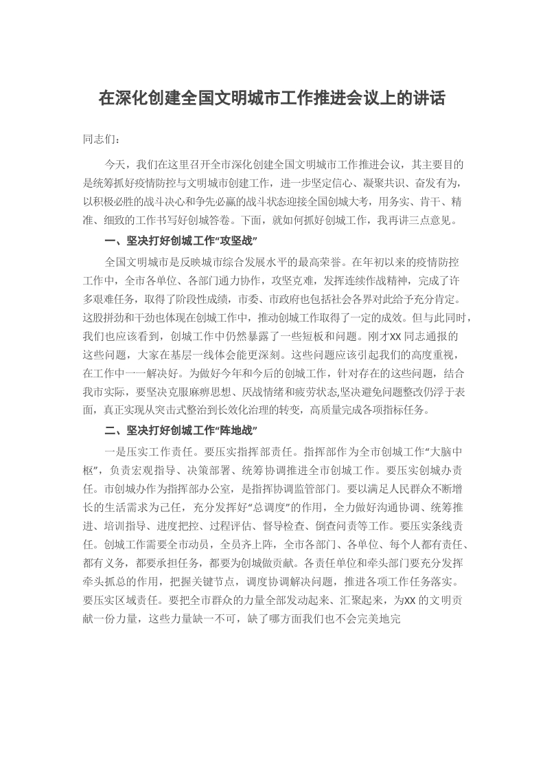 / 在深化创建全国文明城市工作推进会议上的讲话