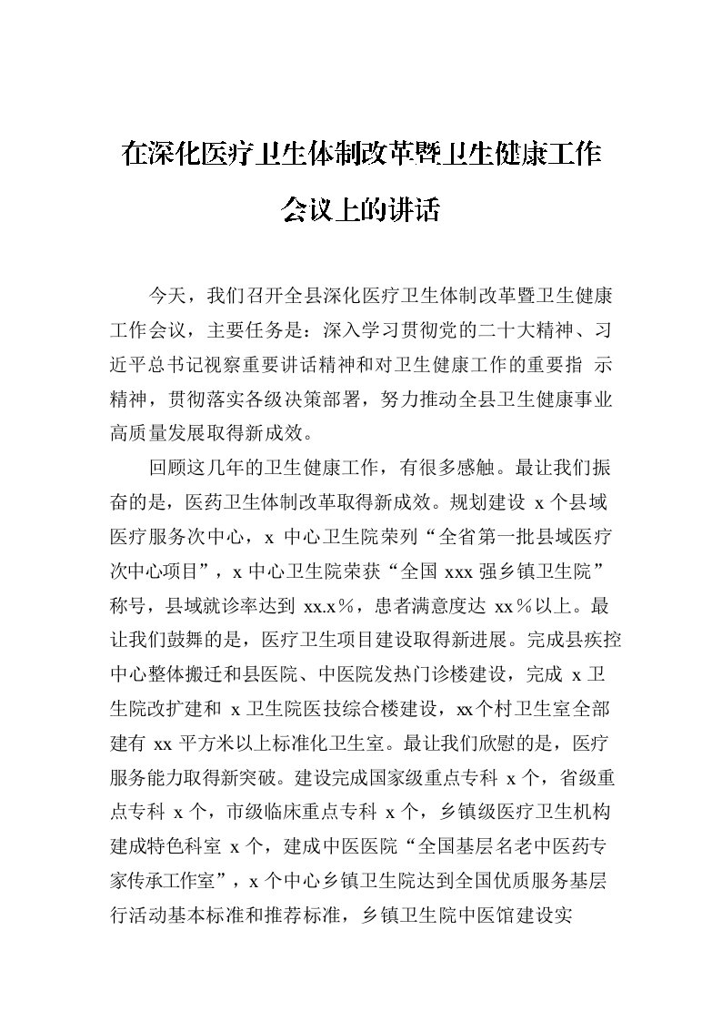 / 在深化医疗卫生体制改革暨卫生健康工作会议上的讲话