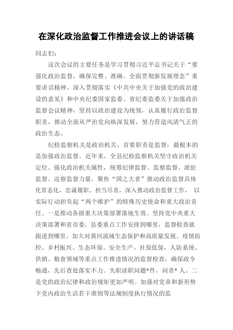 / 在深化政治监督工作推进会议上的讲话稿