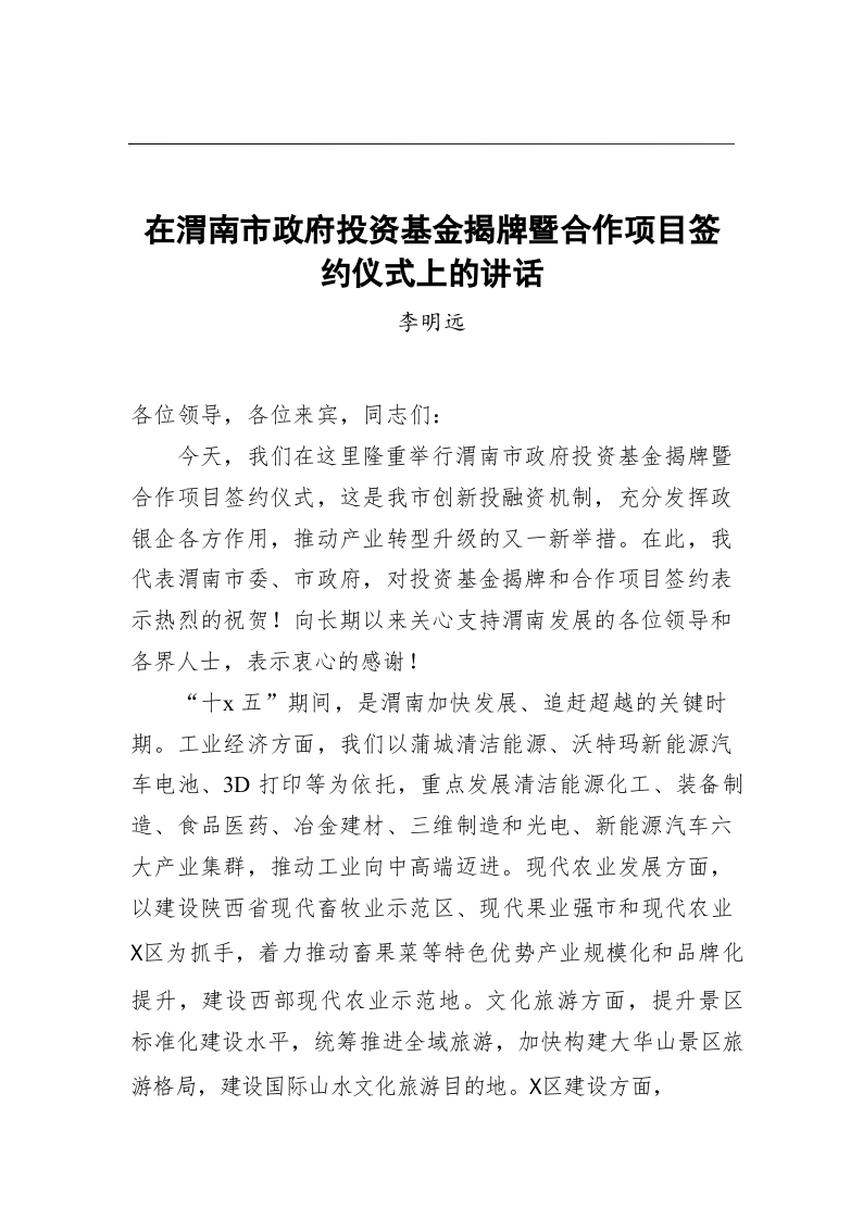 / 在渭南市政府投资基金揭牌暨合作项目签约仪式上的讲话