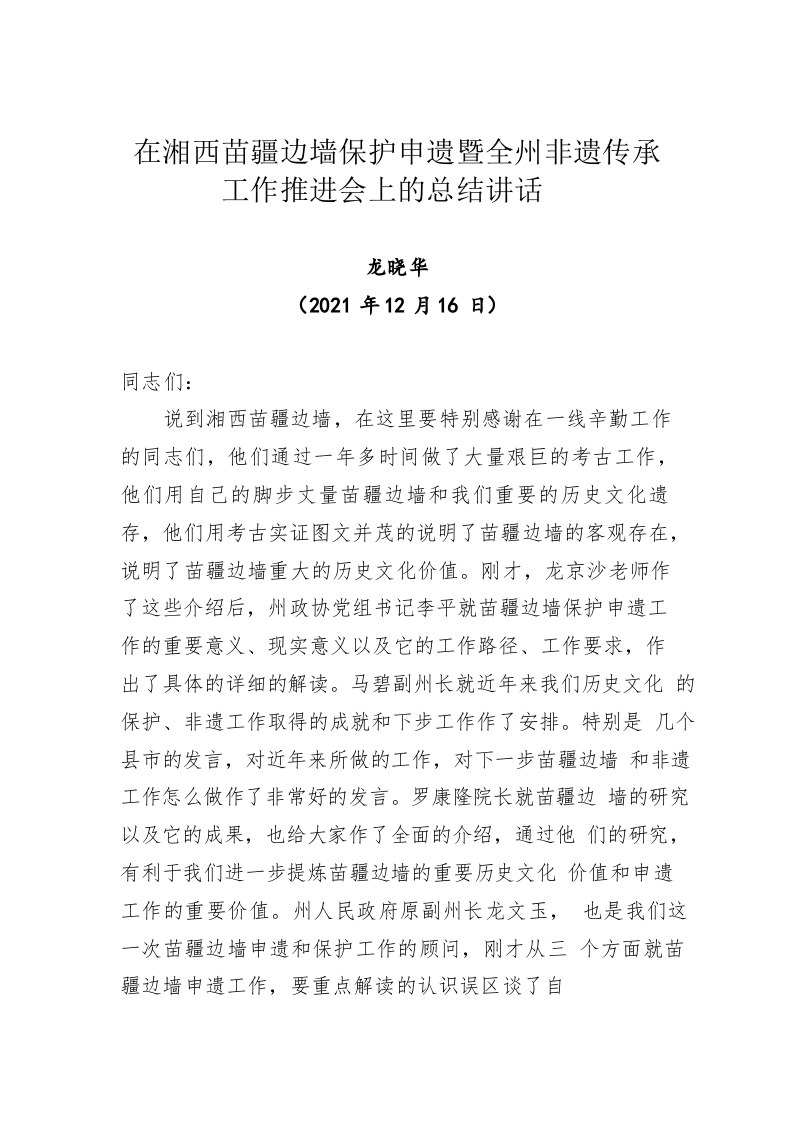 / 在湘西苗疆边墙保护申遗暨全州非遗传承工作推进会上的总结讲话(20211216)