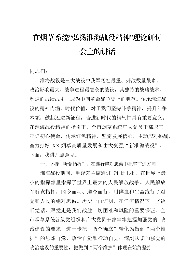 / 在烟草系统“弘扬淮海战役精神”理论研讨会上的讲话