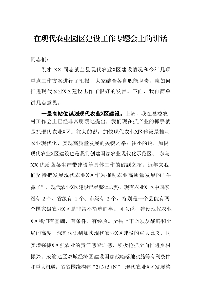 / 在现代农业园区建设工作专题会上的讲话