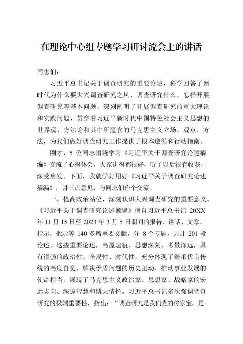 / 在理论中心组专题学习研讨流会上的讲话