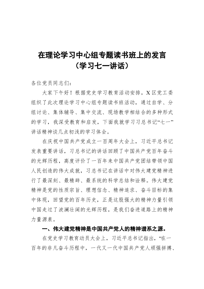 / 在理论学习中心组专题读书班上的发言(学习七一讲话)