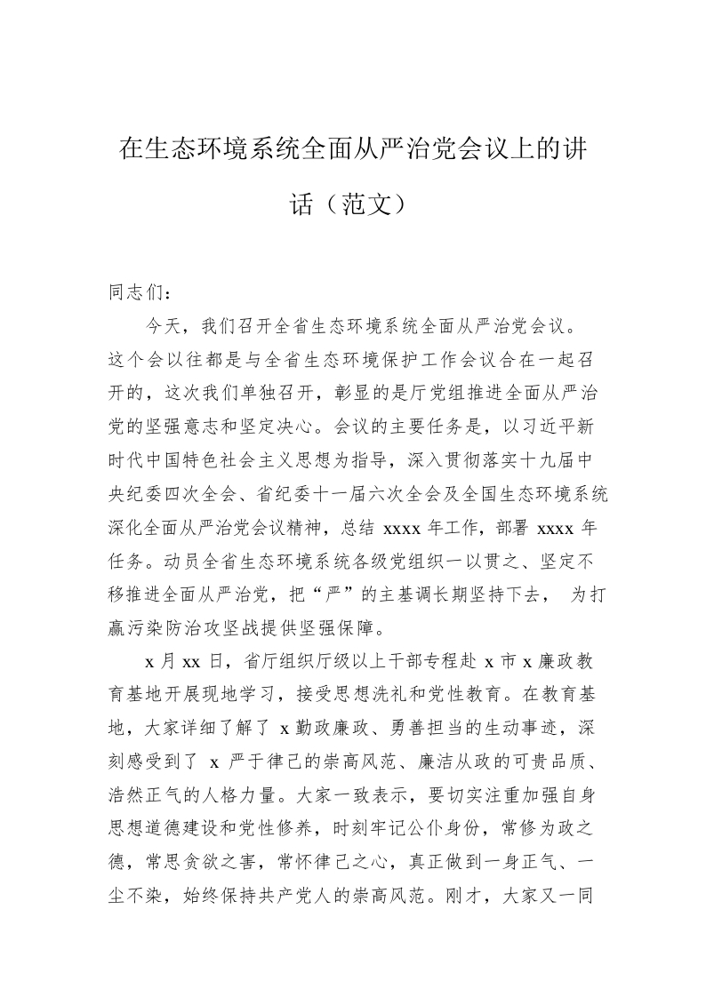 / 在生态环境系统全面从严治党会议上的讲话(范文)