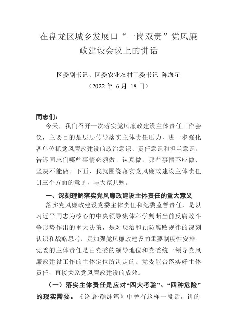/ 在盘龙区城乡发展口“一岗双责”党风廉政建设会议上的讲话