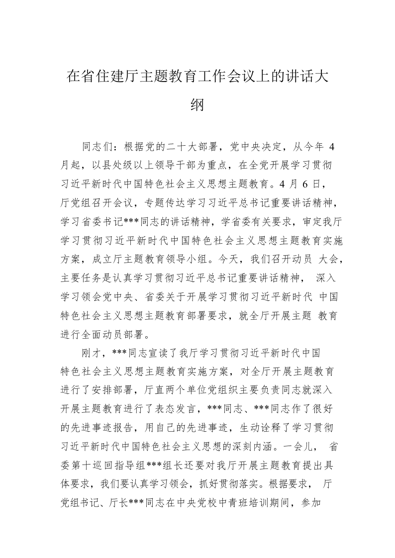 / 在省住建厅主题教育工作会议上的讲话大纲