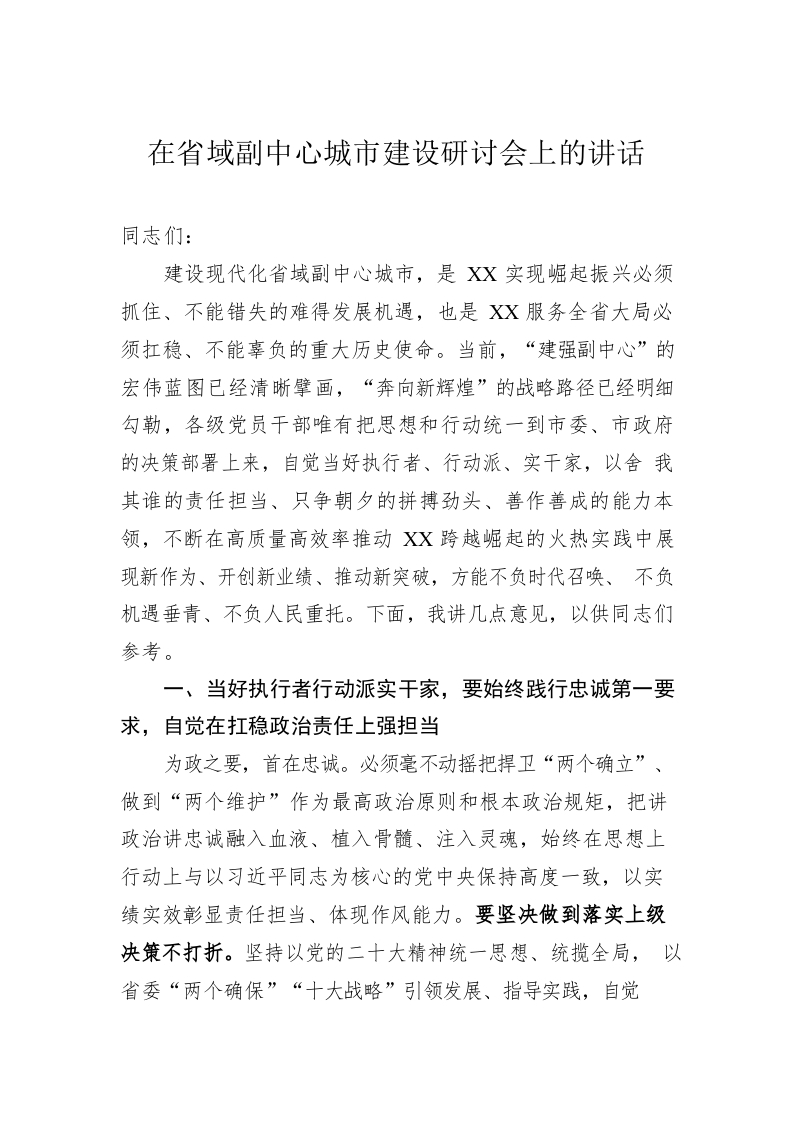 / 在省域副中心城市建设研讨会上的讲话