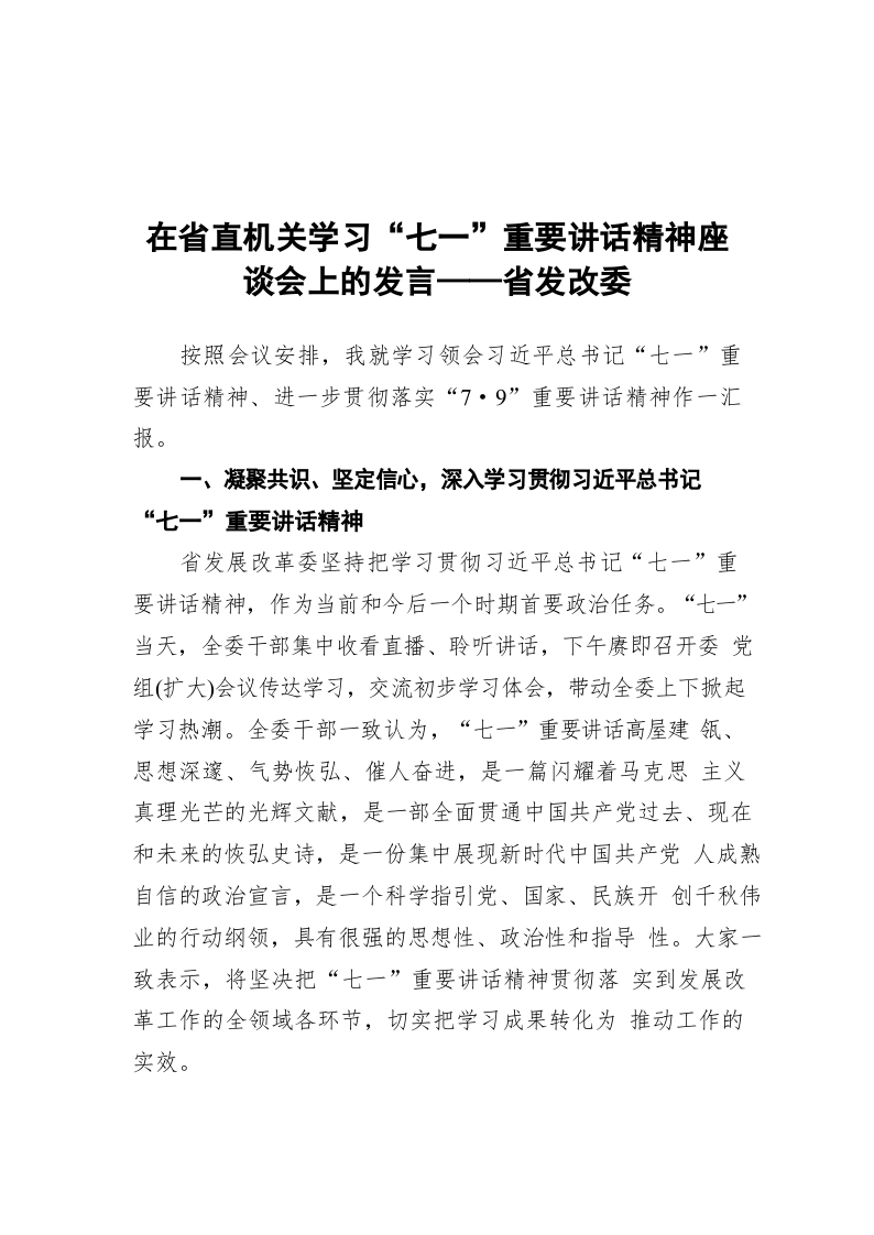 / 在省直机关学习“七一”重要讲话精神座谈会上的发言——省发改委