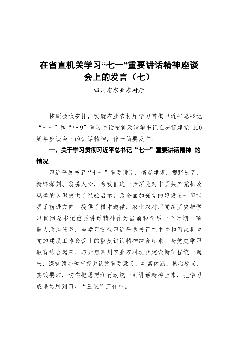 / 在省直机关学习“七一”重要讲话精神座谈会上的发言(七)