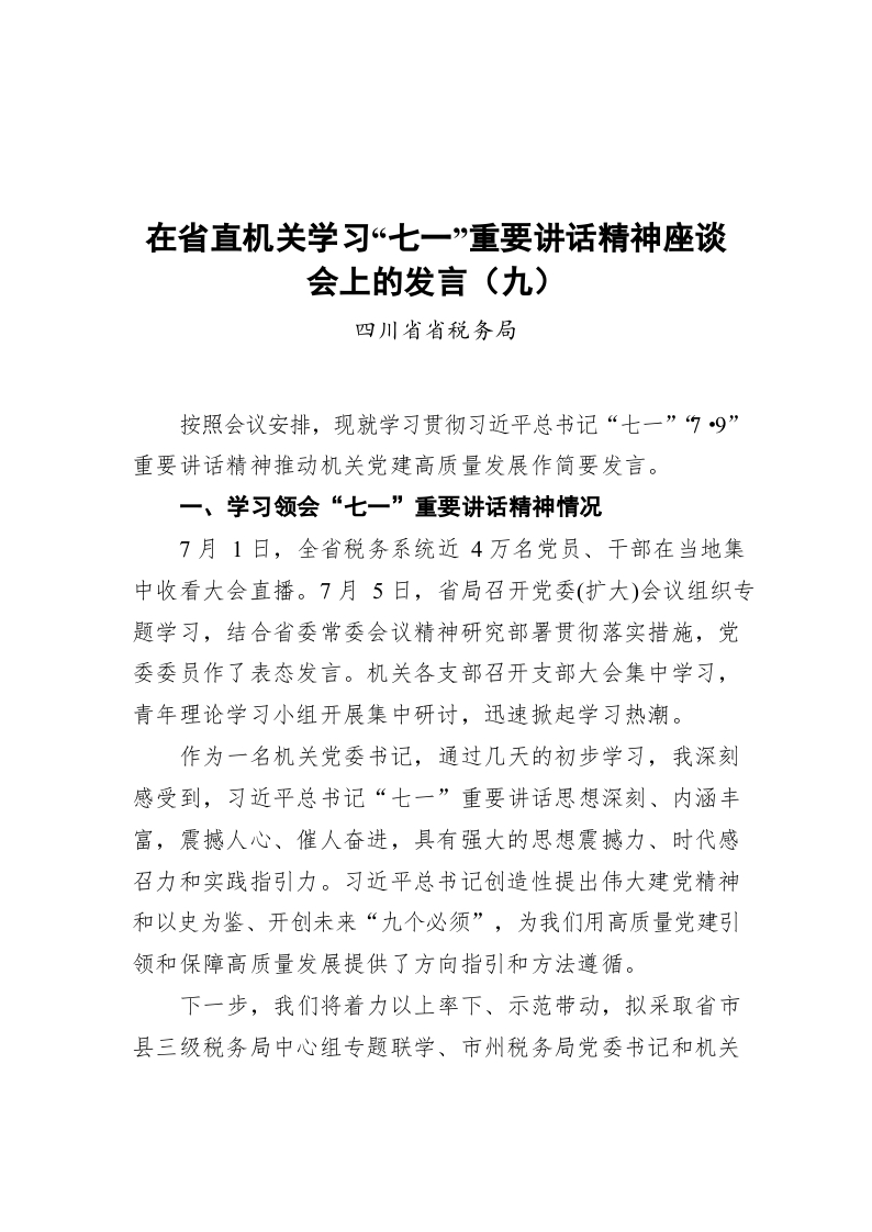 / 在省直机关学习“七一”重要讲话精神座谈会上的发言(九)