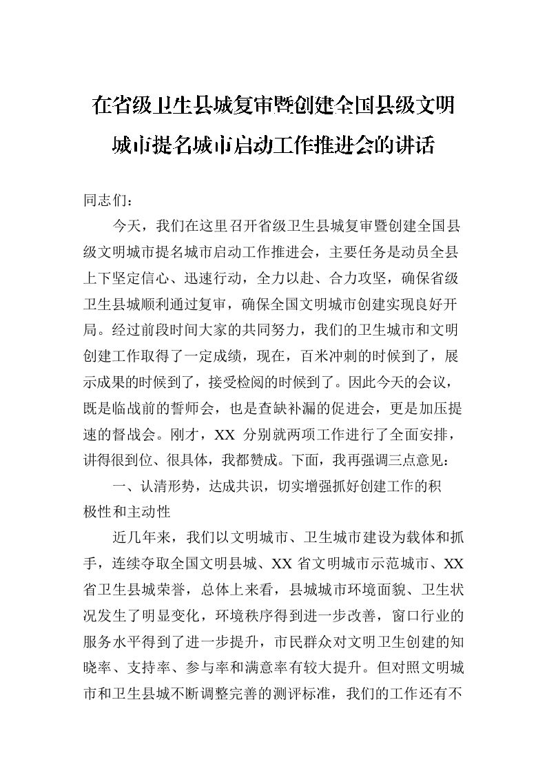 / 在省级卫生县城复审暨创建全国县级文明城市提名城市启动工作推进会的讲话