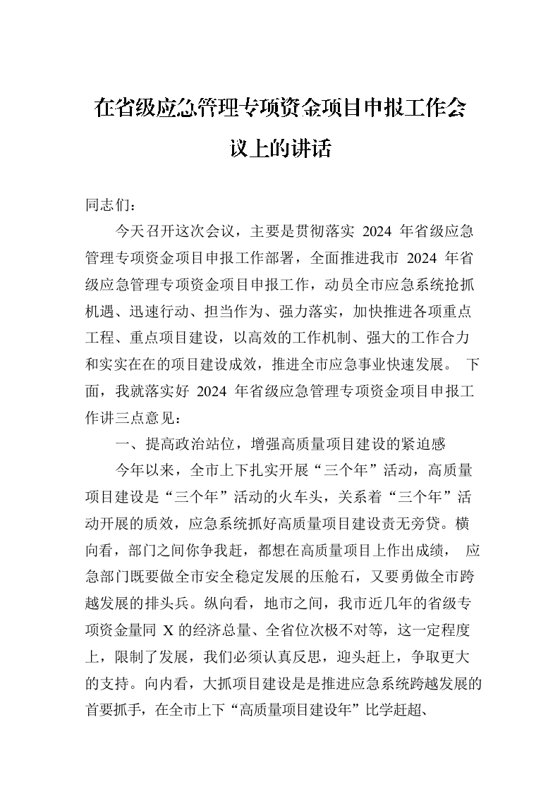 / 在省级应急管理专项资金项目申报工作会议上的讲话