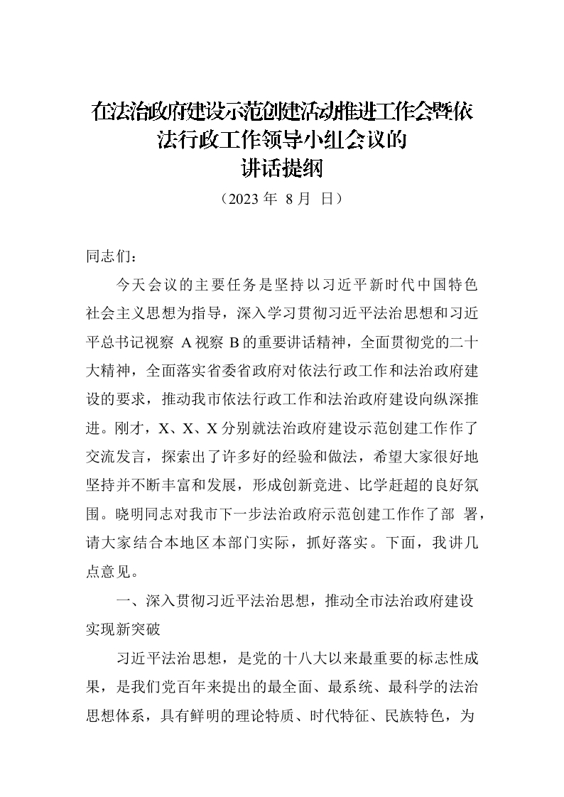 / 在石家庄市法治政府建设示范创建活动推进工作会暨依法行政工作领导小组会议的讲话提纲