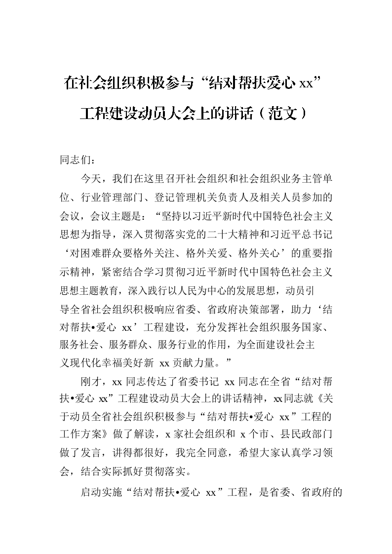 / 在社会组织积极参与“结对帮扶爱心xx”工程建设动员大会上的讲话(范文)