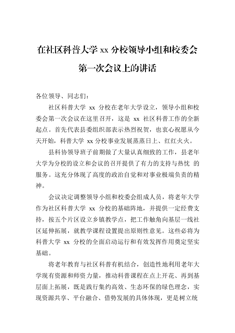 / 在社区科普大学xx分校领导小组和校委会第一次会议上的讲话