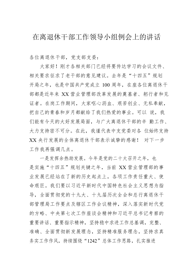 / 在离退休干部工作领导小组例会上的讲话