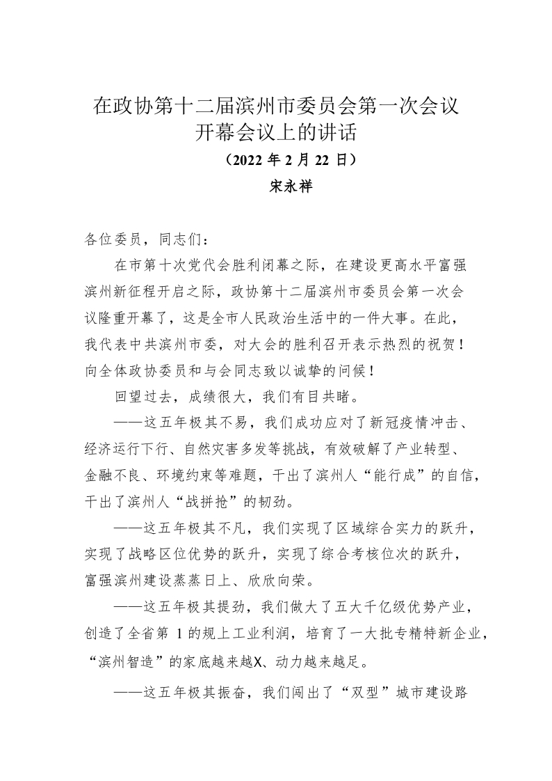 宋永祥在政协第十二届滨州市委员会第一次会议开幕会议上的讲话(20220222)