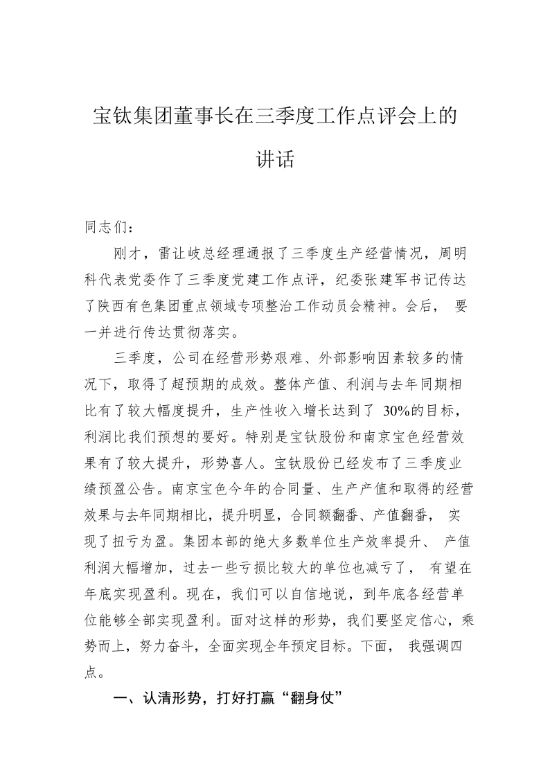 宝钛集团董事长在三季度工作点评会上的讲话