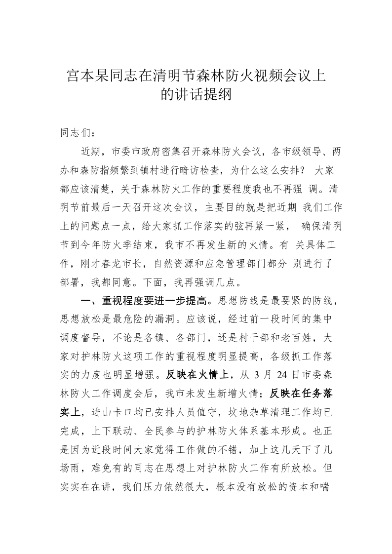 / 宫本杲同志在清明节森林防火视频会议上的讲话提纲