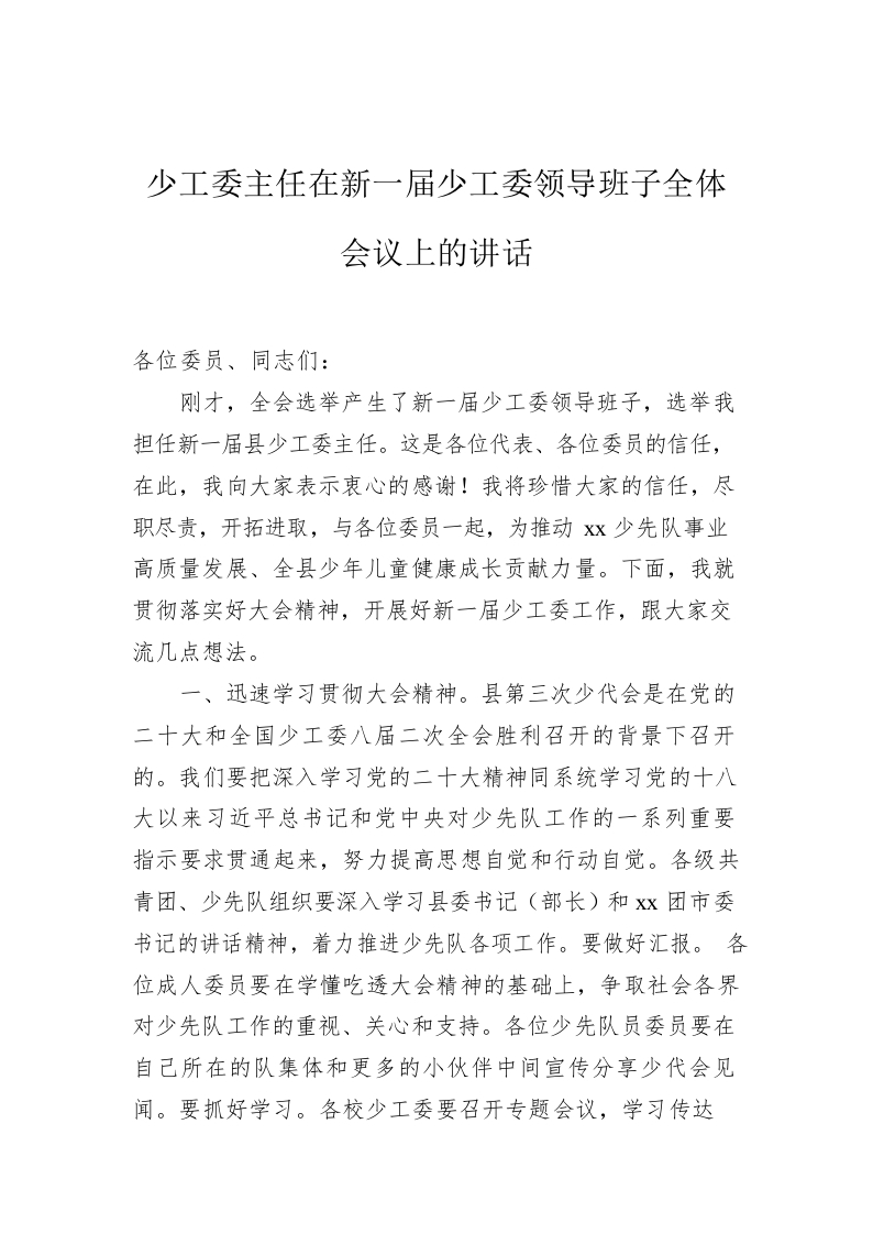 / 少工委主任在新一届少工委领导班子全体会议上的讲话
