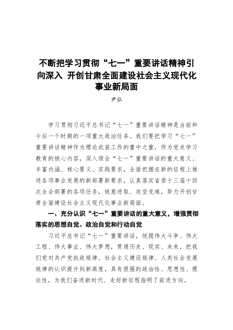 / 尹弘:不断把学习贯彻“七一”重要讲话精神引向深入 开创甘肃全面建设社会主义现代化事业新局面