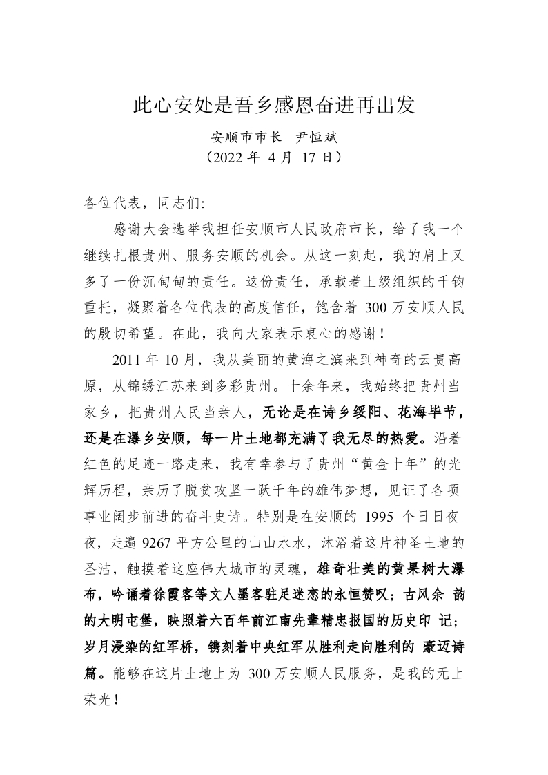 / 尹恒斌:在当选安顺市市长后的讲话(20220417)