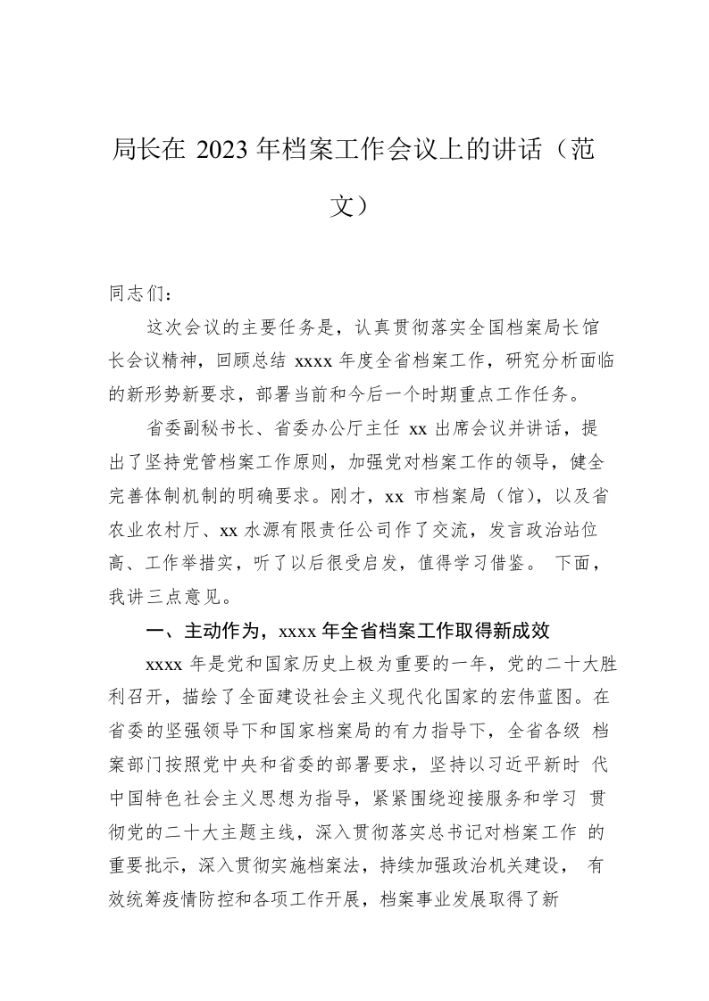 / 局长在2023年档案工作会议上的讲话(范文)