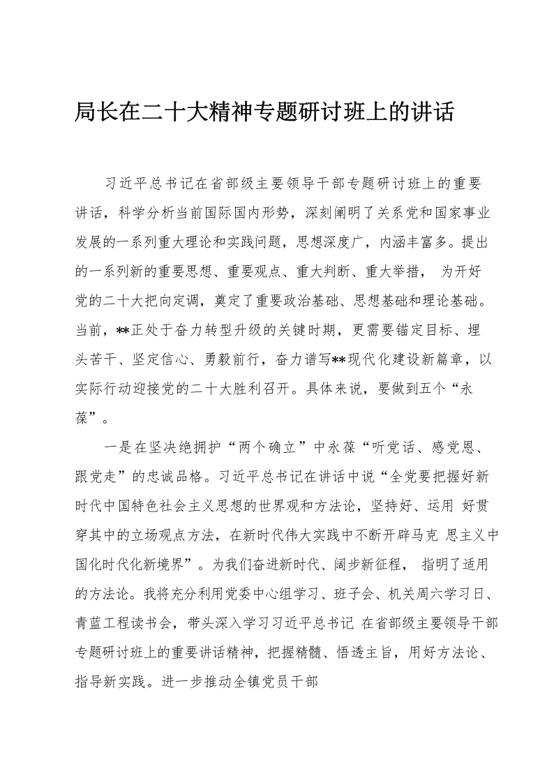 局长在二十大精神专题研讨班上的讲话