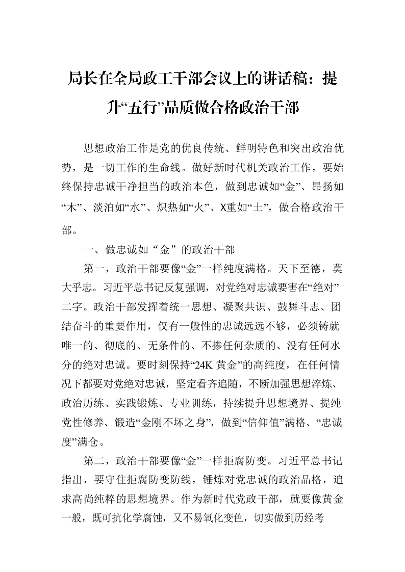 / 局长在全局政工干部会议上的讲话稿:提升“五行”品质做合格政治干部