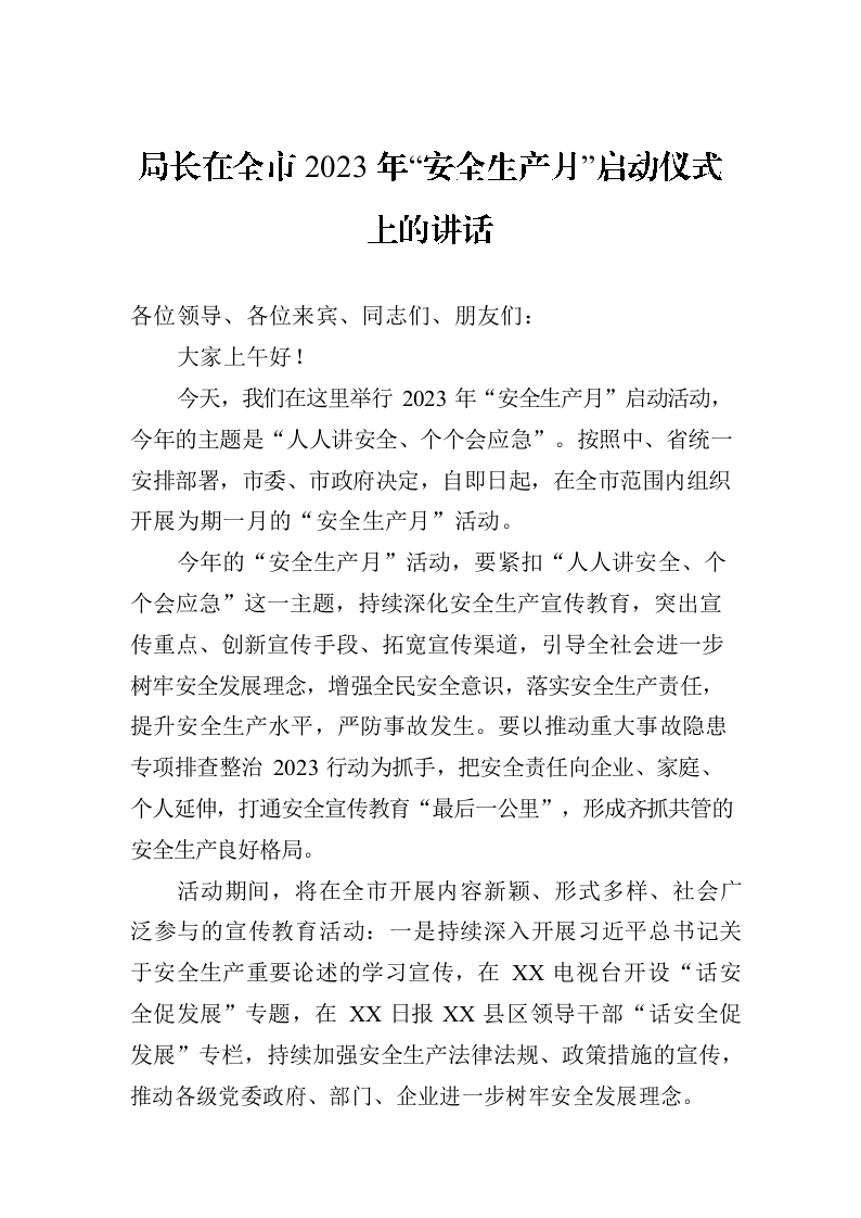 / 局长在全市2023年“安全生产月”启动仪式上的讲话