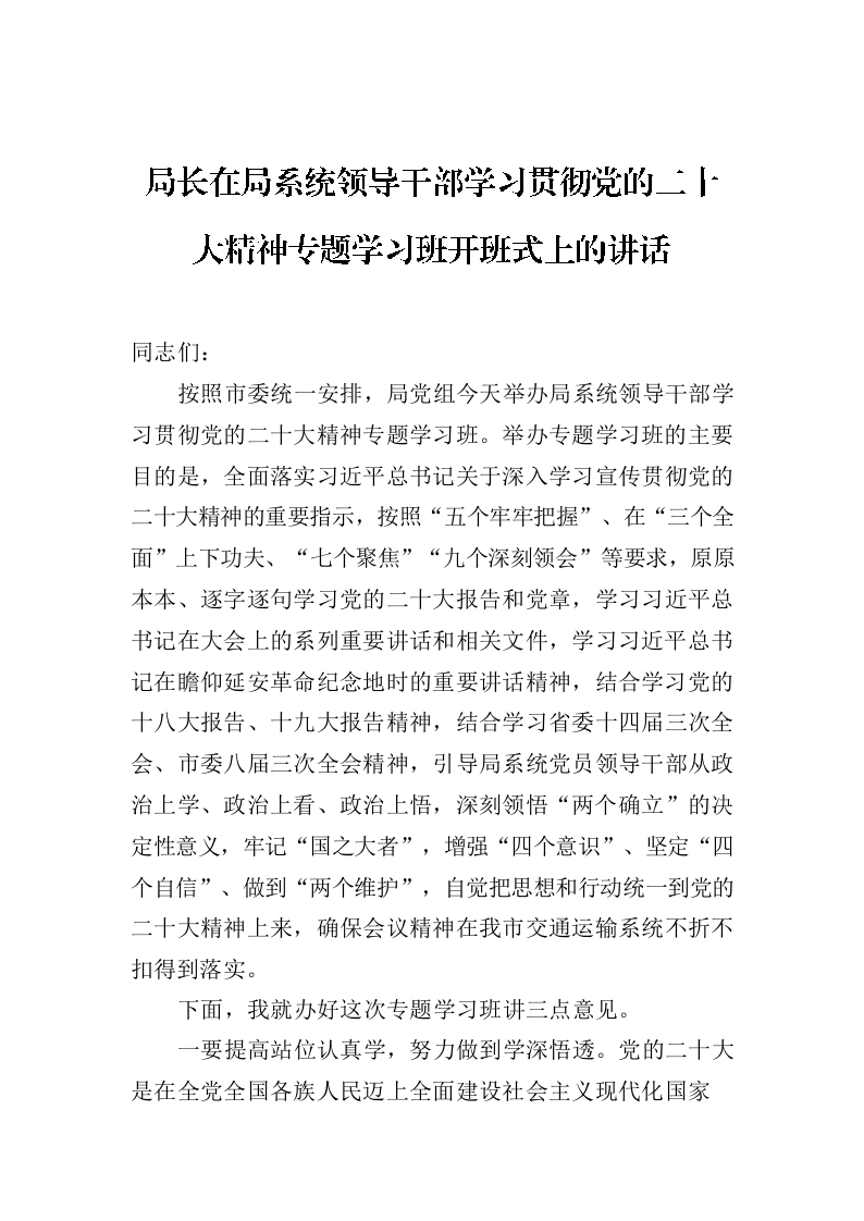/ 局长在局系统领导干部学习贯彻党的二十大精神专题学习班开班式上的讲话