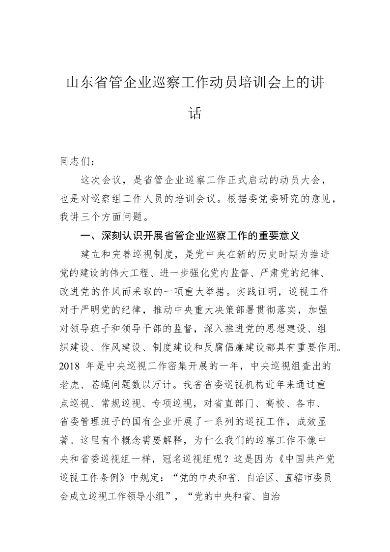 / 山东省管企业巡察工作动员培训会上的讲话