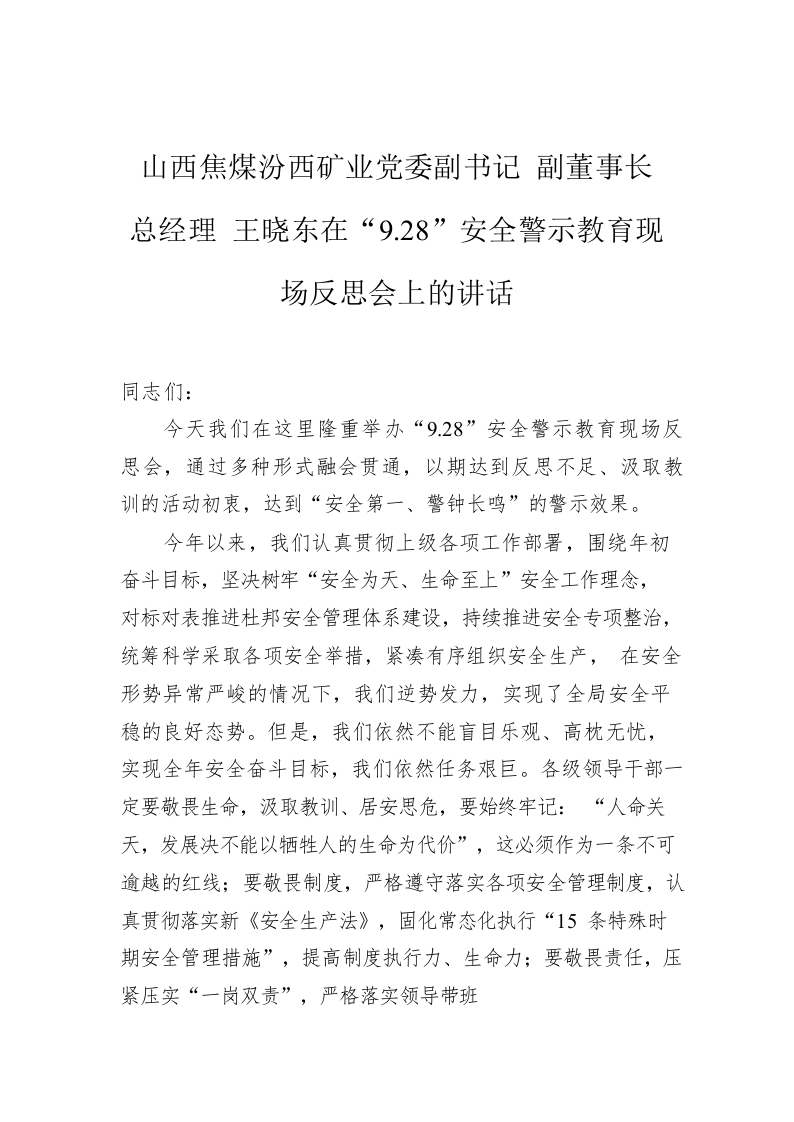 / 山西焦煤汾西矿业党委副书记 副董事长 总经理 王晓东在“9.28”安全警示教育现场反思会上的讲话