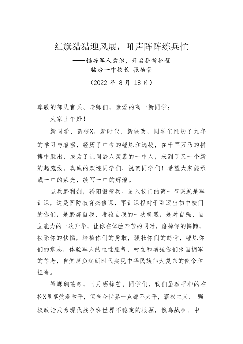 山西省临汾一中校长:张杨管在2022级新生军训开营仪式上的讲话(20220818)