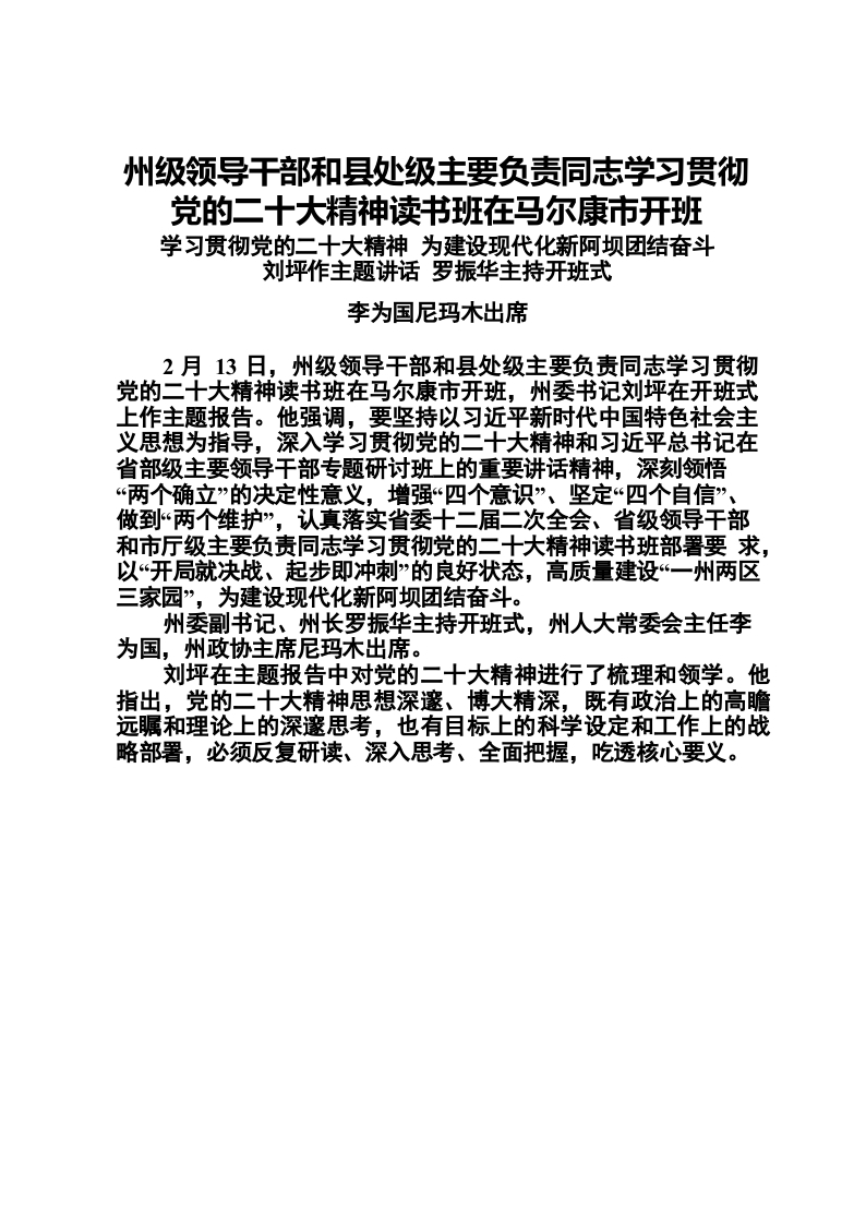 / 州级领导干部和县处级主要负责同志学习贯彻党的二十大精神读书班在马尔康市开班(新闻稿)