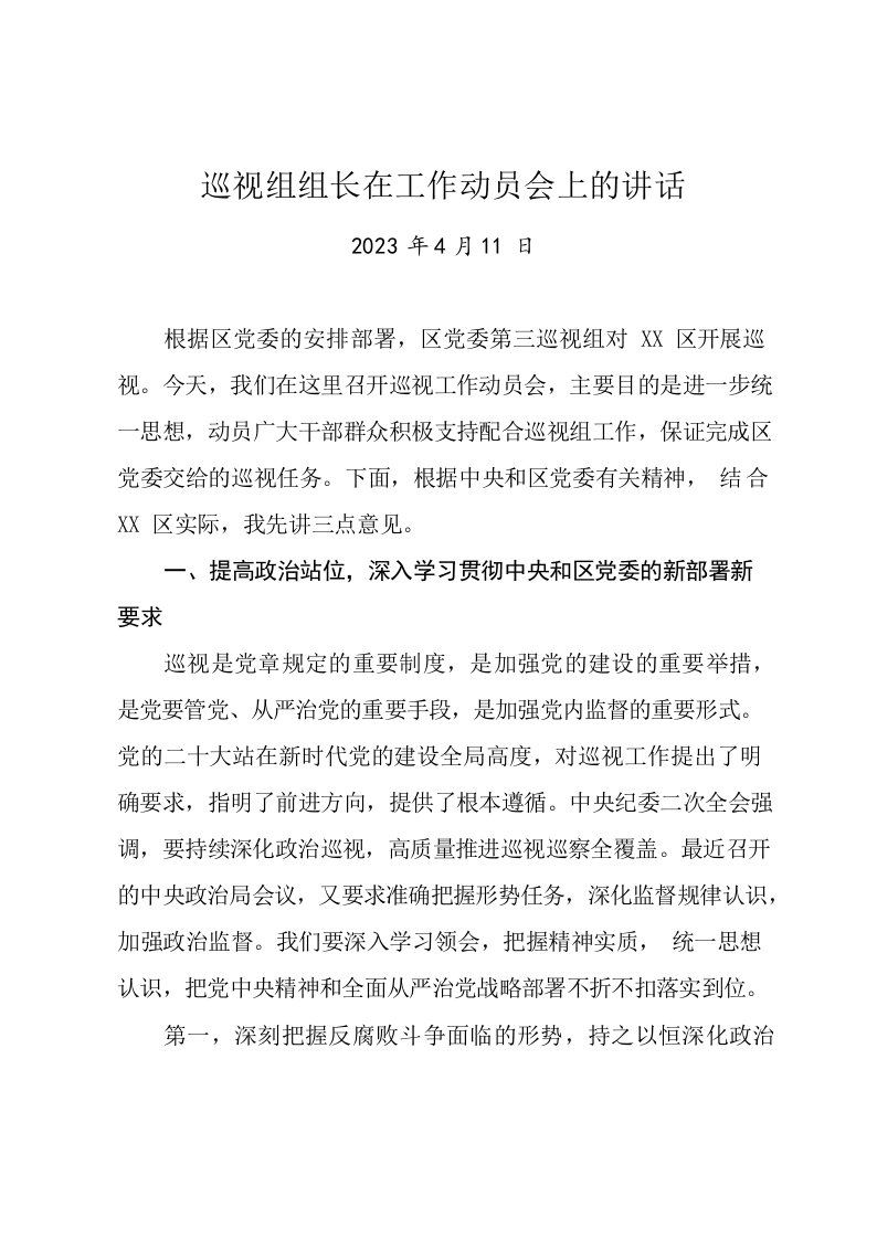 / 巡视组组长在工作动员会上的讲话