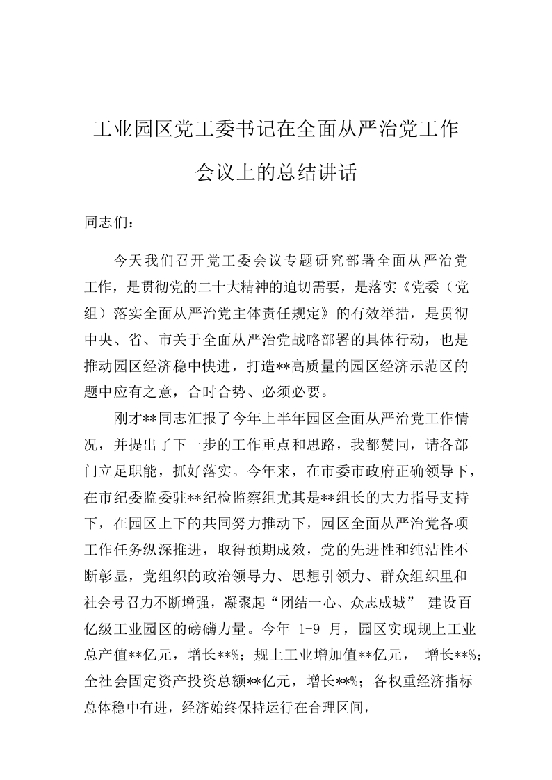 / 工业园区党工委书记在全面从严治党工作会议上的总结讲话