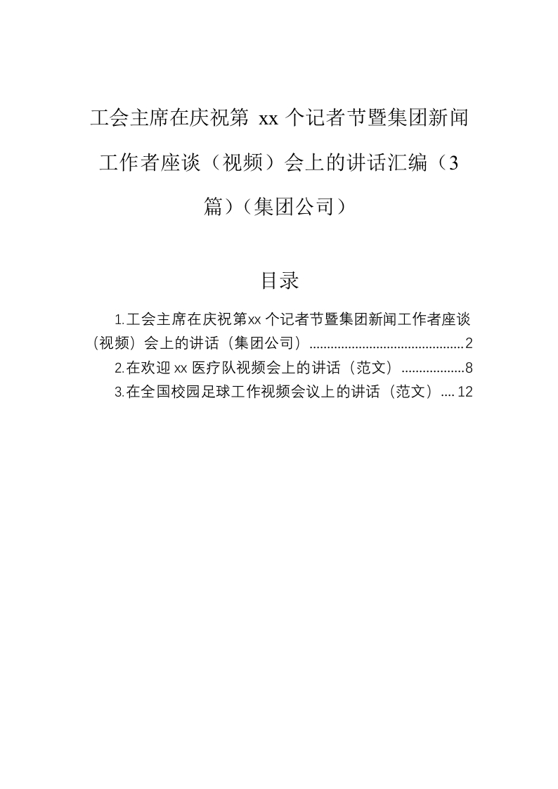 / 工会主席在庆祝第xx个记者节暨集团新闻工作者座谈(视频)会上的讲话汇编(3篇)(集团公司)