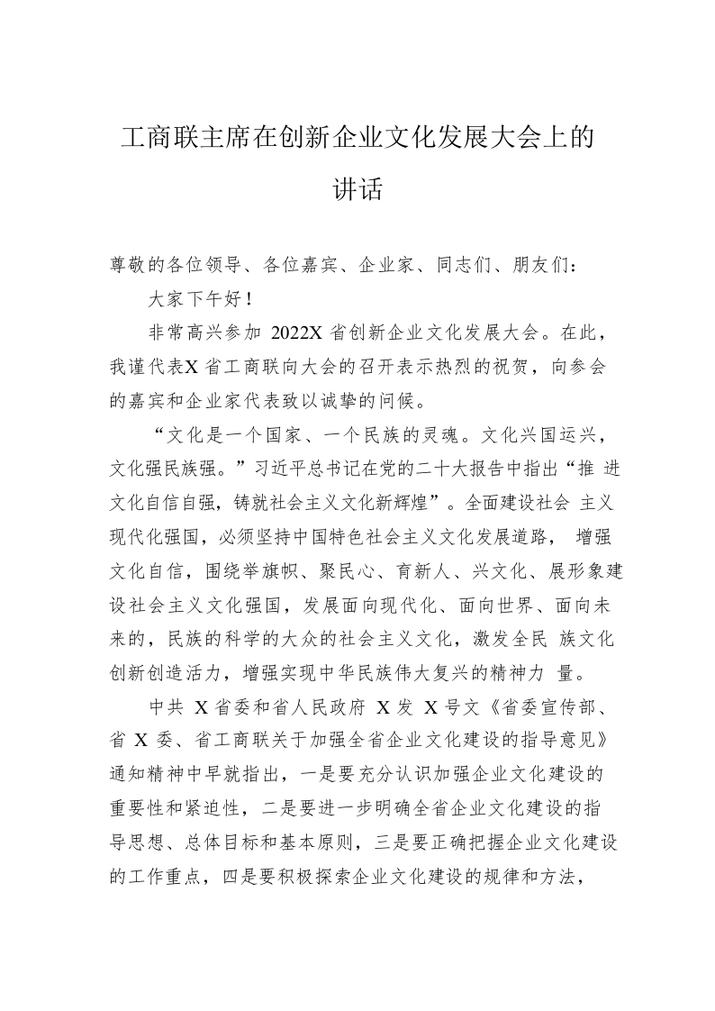 / 工商联主席在创新企业文化发展大会上的讲话