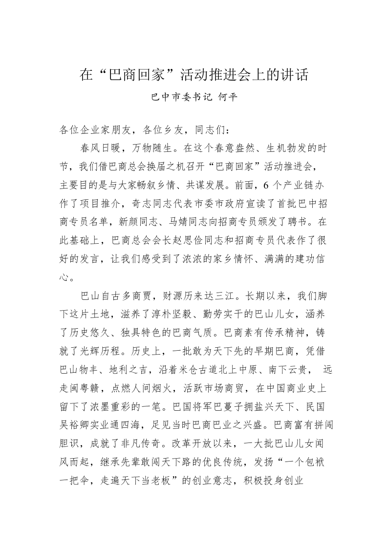 / 巴中市委书记何平:在“巴商回家”活动推进会上的讲话(20230302)