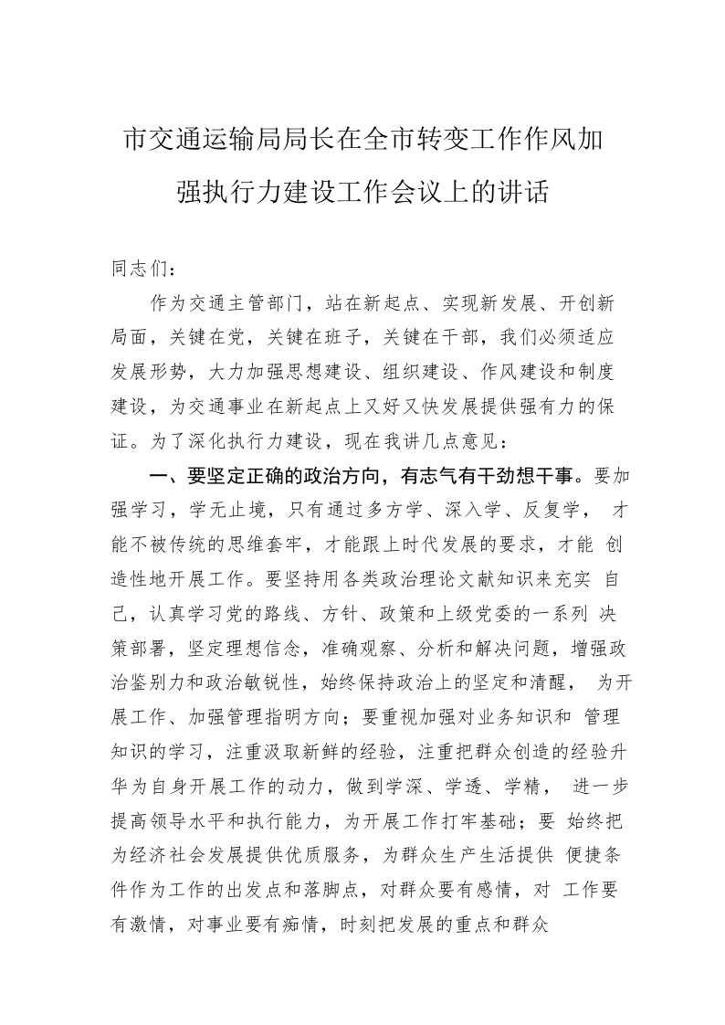 / 市交通运输局局长在全市转变工作作风加强执行力建设工作会议上的讲话