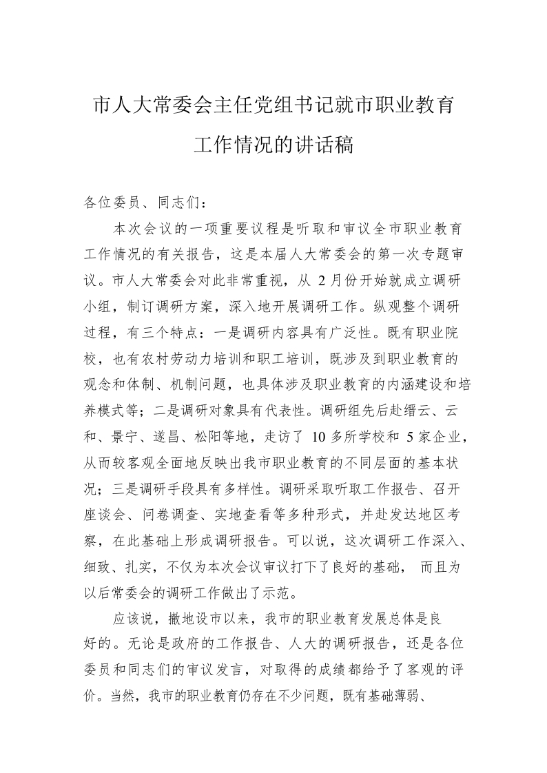 / 市人大常委会主任党组书记就市职业教育工作情况的讲话稿