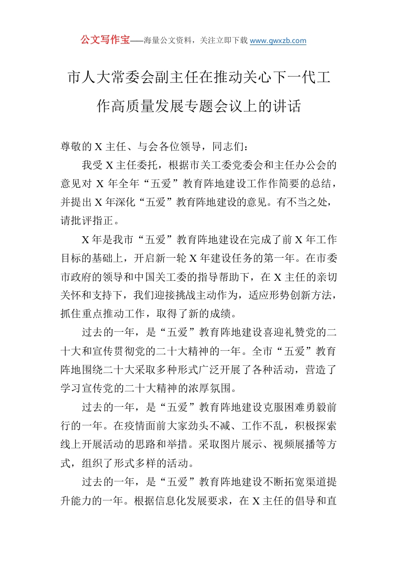 / 市人大常委会副主任在推动关心下一代工作高质量发展专题会议上的讲话
